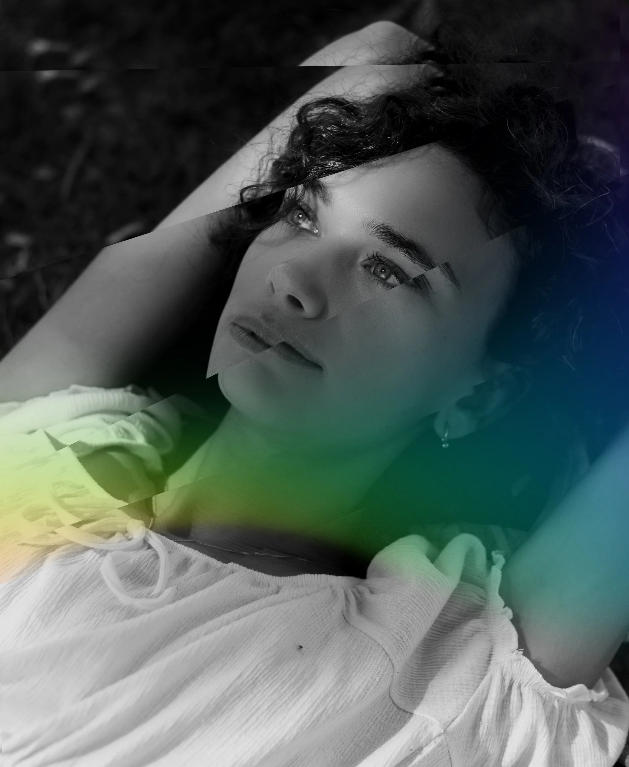 Abstract portrait of a woman with long hair, featuring a geometric overlay and rainbow color effect.